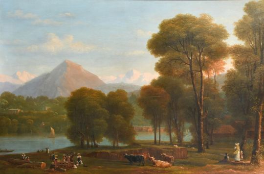 Samuel John Stump (1778-1863), figures and livestock on the banks of Lake Geneva, oil on canvas, signed and dated 1833, inscription verso 'The Lake of Geneva Painted from Nature for the Hon. Thos Robt 4th Baron Dinsadale, by the Swiss Artist S. J. Stump', 24" x 36" (61 x 91.5cm).