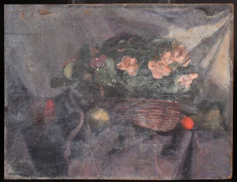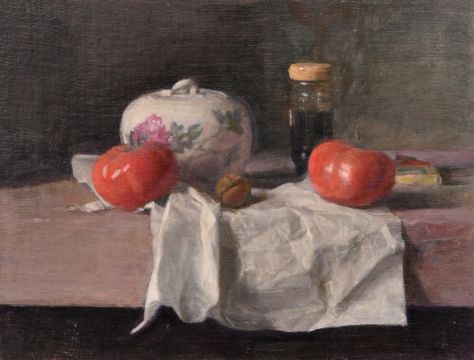 Georges Weissbort (1928-2013), a pair of still life works featuring a porcelain jar and tomatoes and the other featuring flowers, oil on canvas laid down, 10.5" x 13.5" (27 x 34cm), unframed, (2).