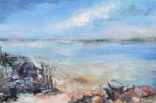 Anne Ridd, Contemporary, 'Langstone', a coastal view, acrylic on card, signed, inscribed and dated 2022, 7" x 10" (18 x 26cm).