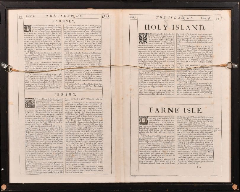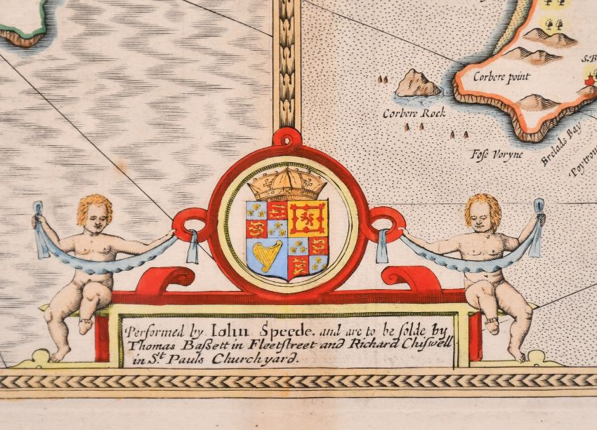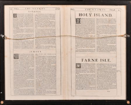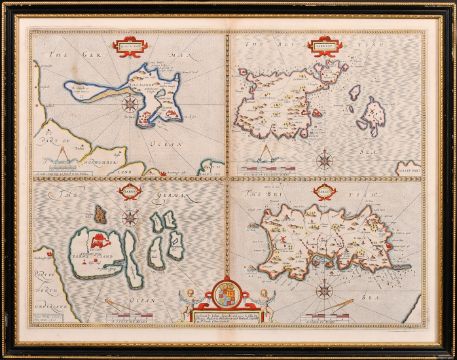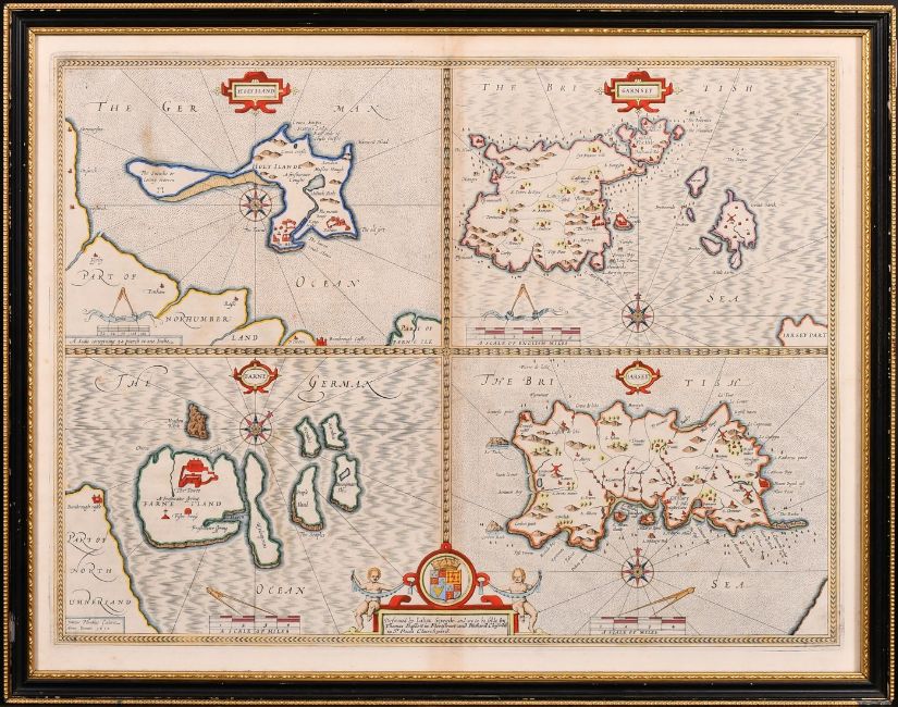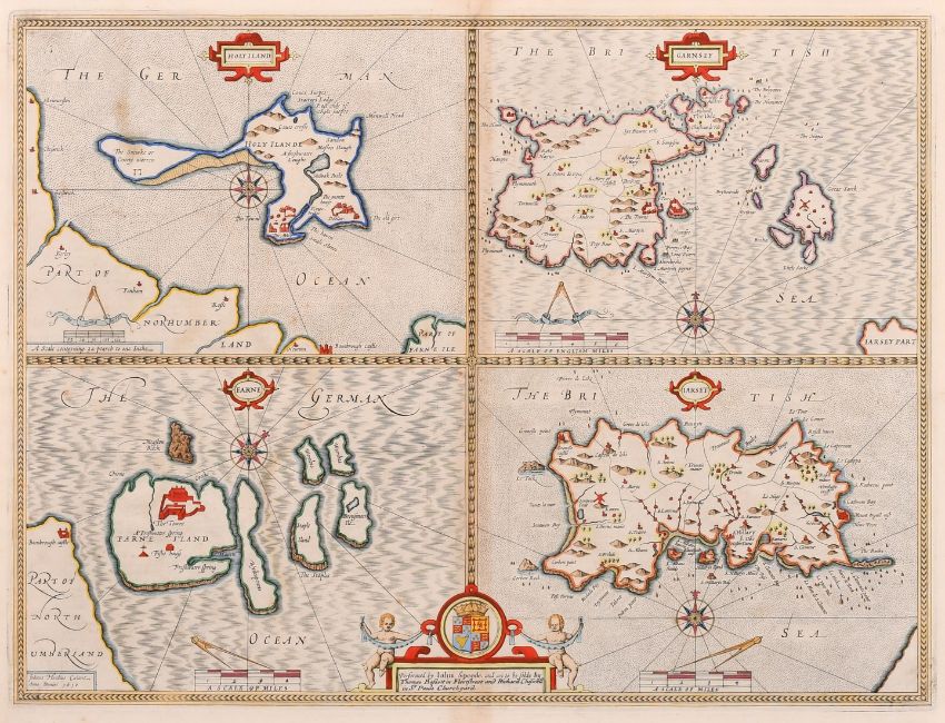 John Speede, A 17th Century engraved map of 'Holy Iland, Garnsey, Farne and Jarsey', hand coloured, plate size 15 x 20in (38 x 51cm).
