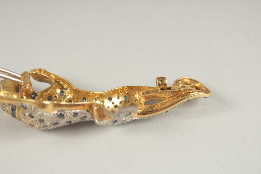 A SUPERB YELLOW GOLD DIAMOND AND SAPPHIRE PANTHER BROOCH, POSSIBLY CARTIER, the body set with diamonds and sapphires, with sapphire collar and ruby eyes.