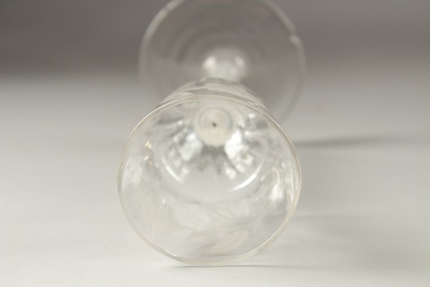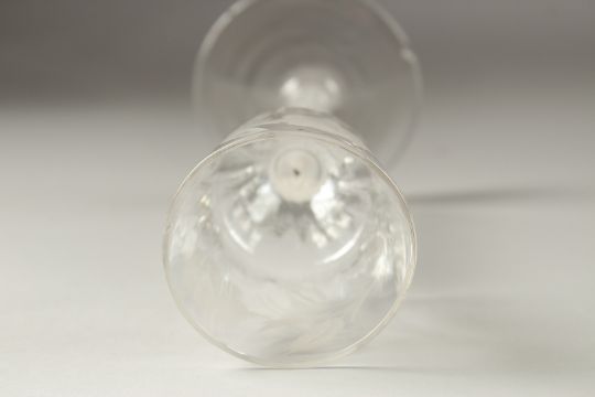 A GEORGIAN WINE GLASS, the bowl engraved with roses, with air twist stem.