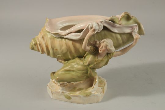 A ROYAL DUX PORCELAIN SHAPED BOWL held by a young lady.