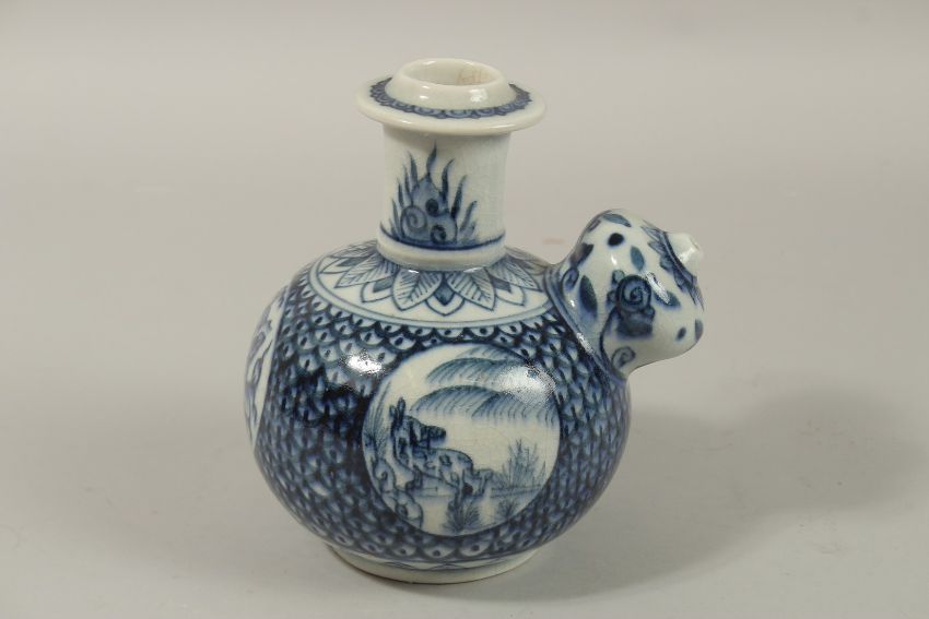 A CHINESE BLUE AND WHITE PORCELAIN KENDI, decorated with panels of flora and fauna, 20cm high.