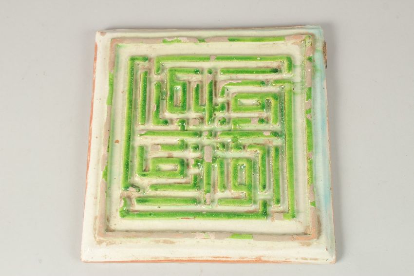 A VERY FINE AND UNUSUAL PERSIAN SAFAVID WHITE AND GREEN GLAZED POTTERY TILE, with raised Kufic calligraphy, 21cm x 21.5cm.