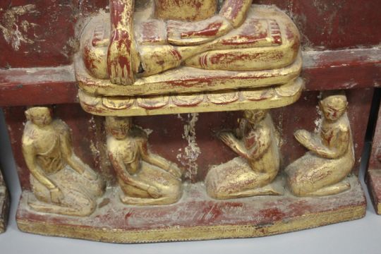 THREE LARGE RELIEF CARVED WOODEN BUDDHISTIC PANELS, each panel gilded and lacquered in red with carved central buddha, each approx. 91cm x 60cm.