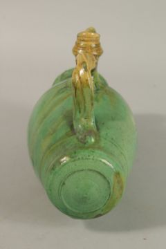 A RARE 19TH CENTURY POSSIBLY OTTOMAN TURKISH CANAKKALE GLAZED POTTERY BARREL SHAPED FLASK, 24cm wide.
