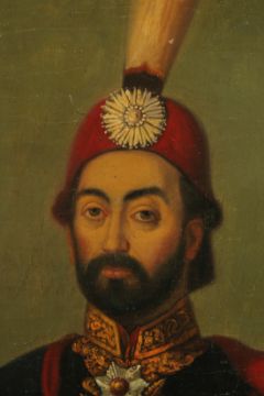 A FINE OIL PORTRAIT ON CANVASS DEPICTING A SULTAN, inset within a carved gilt wood frame, canvass 51cm x 41cm.