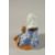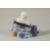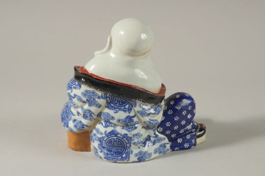A 20TH CENTURY CHINESE PORCELAIN SEATED BUDDHA, with blue and white robes decorated with bats, clouds, and longevity symbols, the base with impressed character mark, 17cm high.