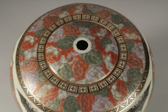 A LARGE JAPANESE SATSUMA JAR AND COVER, painted with panels of figures and landscape scenes with gilt highlights, mark to base, (drilled), 33cm high.