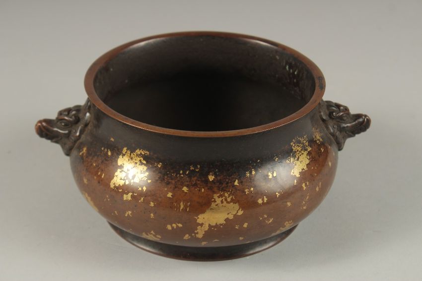 A CHINESE GOLD SPLASH BRONZE TWIN HANDLE CENSER, the base with character mark, 19cm wide handle to handle.