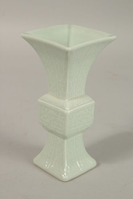 A CHINESE CELADON MINIATURE PORCELAIN GU VASE, with six-character mark, 12.2cm high.