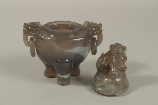 A CHINESE CARVED AGATE TRIPOD KORO AND COVER, with twin drop-ring handles and carved foo dog finial, 17.5cm high.
