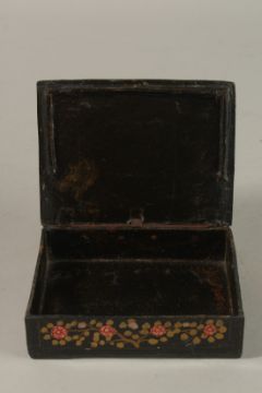 AN INDIAN KASHMIRI LACQUER PAPIER MACHE BOX, 13.5cm x 10.5cm.