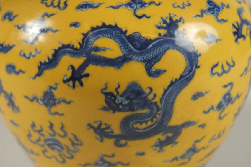 A CHINESE YELLOW GROUND BLUE AND WHITE DRAGON GINGER JAR AND COVER, 30cm high.