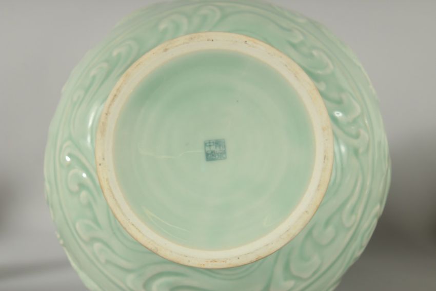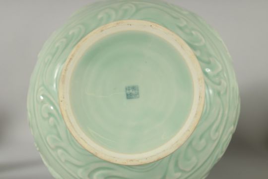 A LARGE CHINESE CELADON GLAZE TWIN HANDLE VASE, with moulded relief dragons, mark to base, 39cm high.