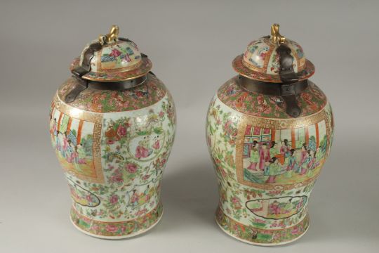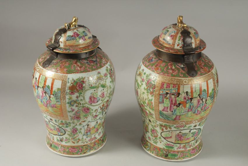 A GOOD PAIR OF 18TH CENTURY CANTON ENAMELLED GINGER JARS AND COVERS, with metal mounts, painted with panels of flowers and figures, 46cm high.