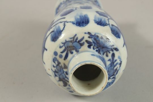 A CHINESE BLUE AND WHITE PORCELAIN VASE, painted with a temple scene, four-character mark to base, 19cm high.