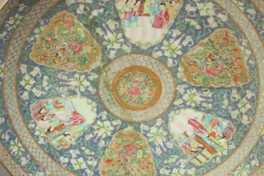 A VERY LARGE CHINESE BLUE GROUND FAMILLE ROSE PORCELAIN PUNCH BOWL AND UNDER-PLATE, enamel painted with panels of figures and flora and finely decorated all over with floral motifs, bowl and dish 39.5cm diameter, (af).