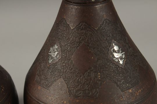 A LARGE PAIR OF 19TH CENTURY PERSIAN QAJAR GOLD AND SILVER INLAID WIN BOTTLES AND STOPPERS, (one with detached neck), 57cm high.