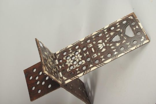 A BONE INLAID WOODEN QURAN STAND.