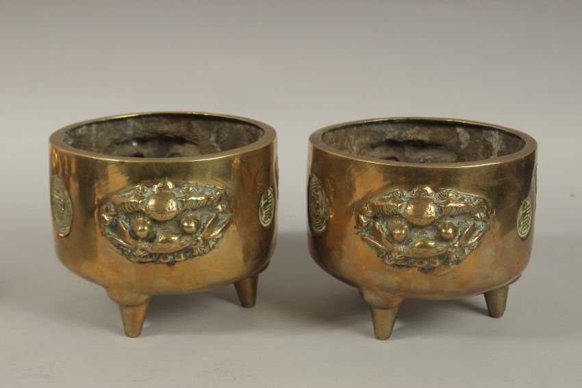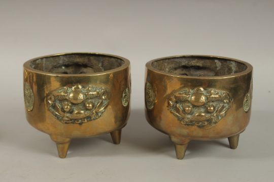 A PAIR OF 19TH CENTURY CHINESE GILT BRONZE TRIPOD CENSERS, with lion-form handles and calligraphy panels, the base with roundel depicting dragons - character mark to centre, 17cm wide handle to handle.