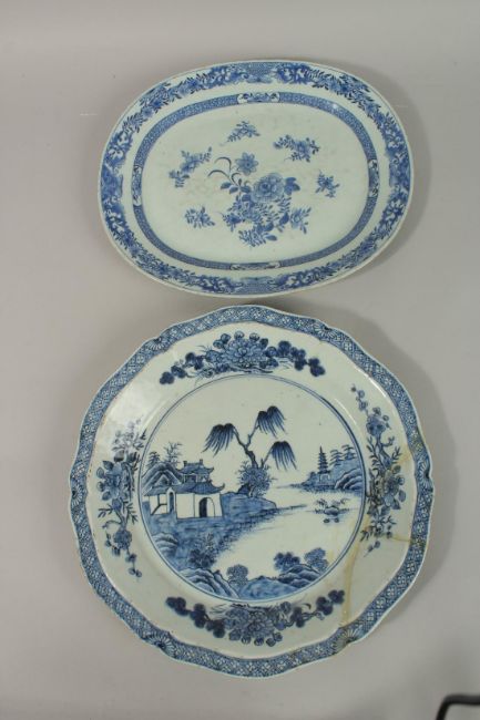 TWO 19TH CENTURY CHINESE BLUE AND WHITE PORCELAIN DISHES, (one af), oval dish 34cm x 28cm, circular plate 34cm wide.