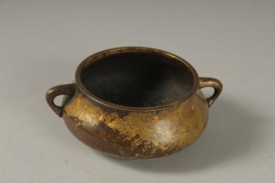 A GOOD SMALL 18TH CENTURY CIRCULAR BRONZE TWIN HANDLE CENSER, Kangxi mark to base, 10cm diameter.