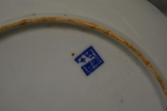 A Chinese blue glazed bottle vase on stand, a small circular porcelain dish and a Japanese blue and white plate.