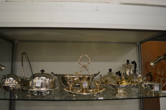 A quantity of plated items to include breakfast dish with hinged cover, bread basket, muffin dish, tea services etc.