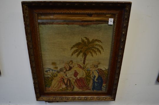 A late Victorian floral embroidered picture of figures under a palm tree.