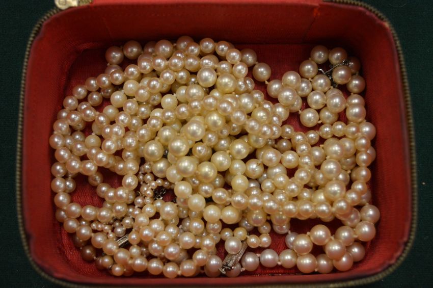 Various pearl necklaces and loose pearls.
