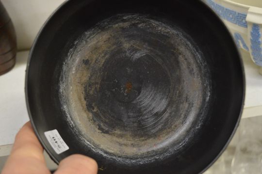 A Wedgwood black basalt jasperware bowl and a Wedgwood cream ware bowl with blue sprig decoration.