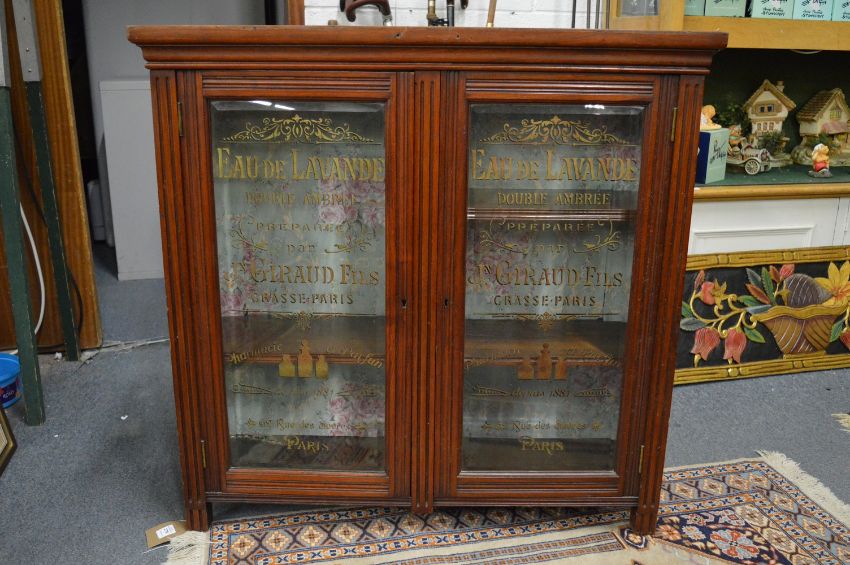 A Victorian walnut two door advertising or shop display cabinet for the Parisian firm Jiraud, each door with gilded lettering and decoration.
