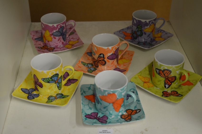 A colourful set of six coffee cans and saucers decorated with butterflies.