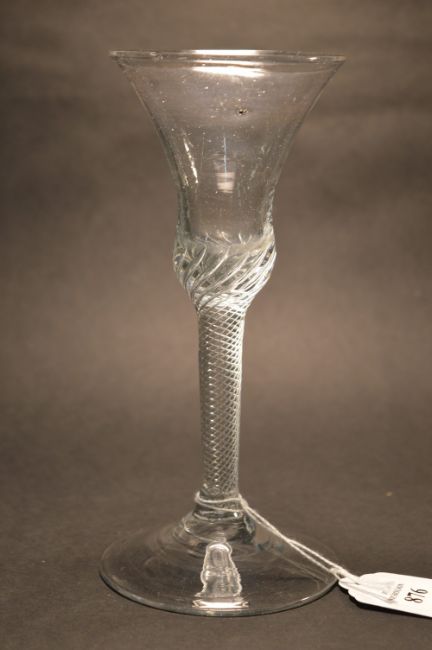 A George III wine glass with air twist stem and trumpet shaped bowl (small rim chip).