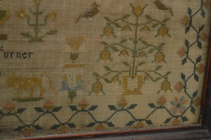 A 19th century sampler, signed Eliza Turner dated 1840, worked with buildings, figures, birds, animals and text, framed and glazed.