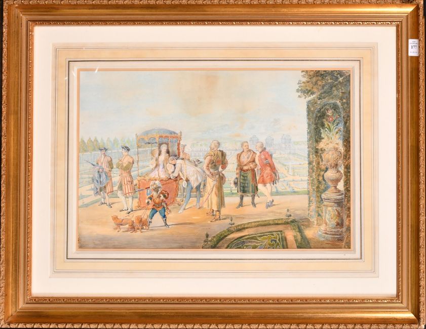After Antonio Bencini, King John Sobieski III surrounded by a lady in a sedan chair and other figures in the gardens of Willanow palace, watercolour, 13" x 19.5" (33 x 49.5cm).