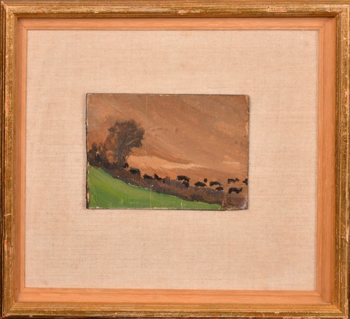 Alexander Dunluce (1935-2021), 'Cows on the Plough, Odiham', oil on canvas laid down, 3.25" x 4.5" (8 x 11.5cm).
