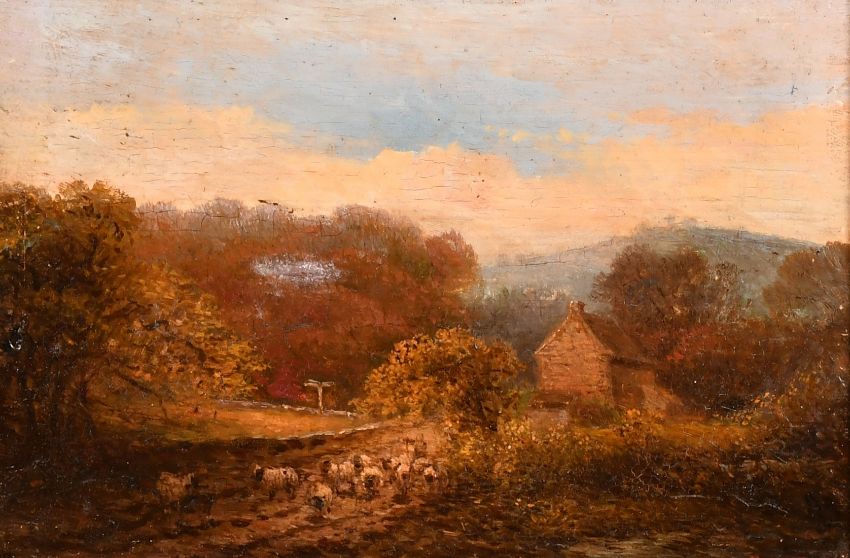 19TH CENTURY ENGLISH SCHOOLSheep on a roadway with cottage.Signed, panel.5ins x 7.5ins ( 12cm x 19cm)