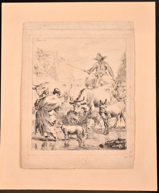 Nicolaes Berchem (1620-1683), two engravings of peasants with livestock, engraving, plate size each 10.75" x 8.5" (27.5 x 21.5cm), unframed, (2).