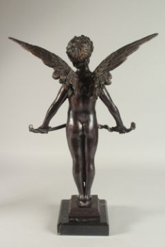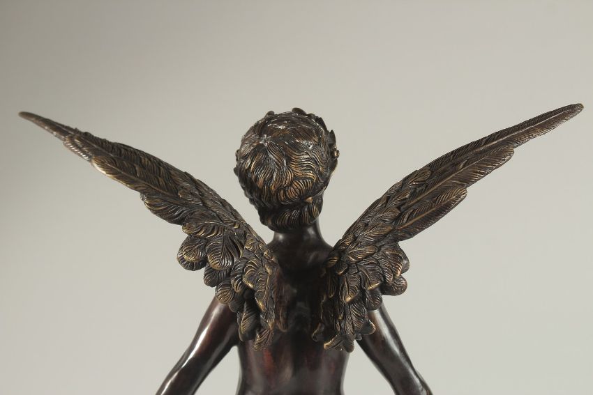 A BRONZE ANGEL WITH WINGS on a square marble base.