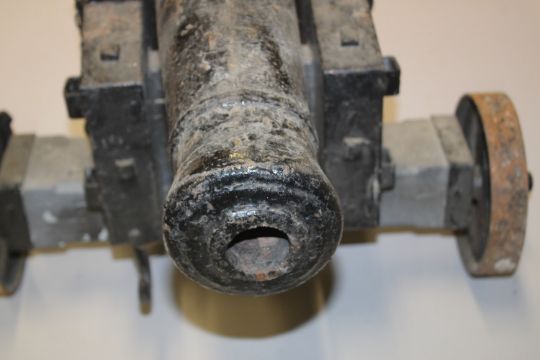 AN 18TH CENTURY CONTINENTAL CAST IRON CANNON, on a wooden wrought iron carriage, with cast iron wheels.