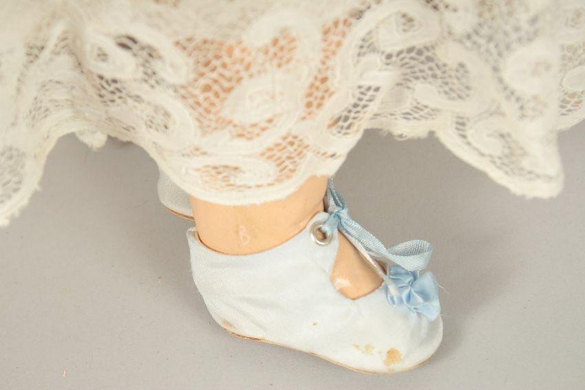 S. F. B. J. FRENCH BISQUE HEADED DOLL, No. 8, with open mouth, blue glass eyes, articulated body, clothed.