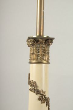 A PAIR OF 19TH CENTURY PORCELAIN LAMPS entwined with vine leaves, on brass square bases.