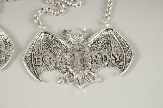 A PAIR OF BAT'S WING WINE LABELS, WHISKY AND SHERRY.