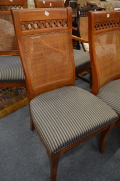 A SET OF TEN CHERRY WOOD AND UPHOLSTERED DINING CHAIRS..