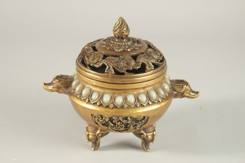 A GOOD CIRCULAR BRONZE AND JADE CENSER AND COVER.