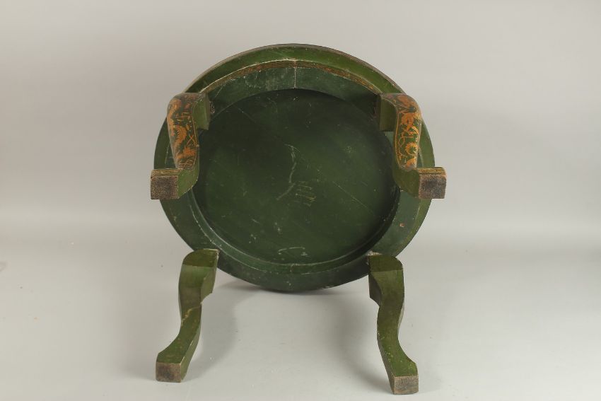 A FINE LATE 19TH CENTURY SIGNED INDIAN KASHMIR LACQUERED WOODEN TABLE, made in the Chinese style depicting gilded dragons and signed by Ganemede of Kasmir, table top 51cm diameter.