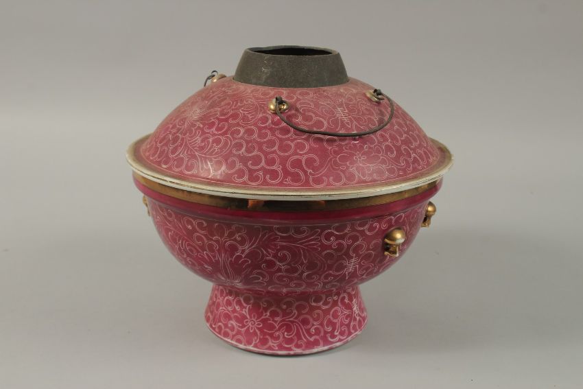 A CHINESE PINK GLAZE PORCELAIN CIRCULAR WARMER AND COVER, 26cm diameter.